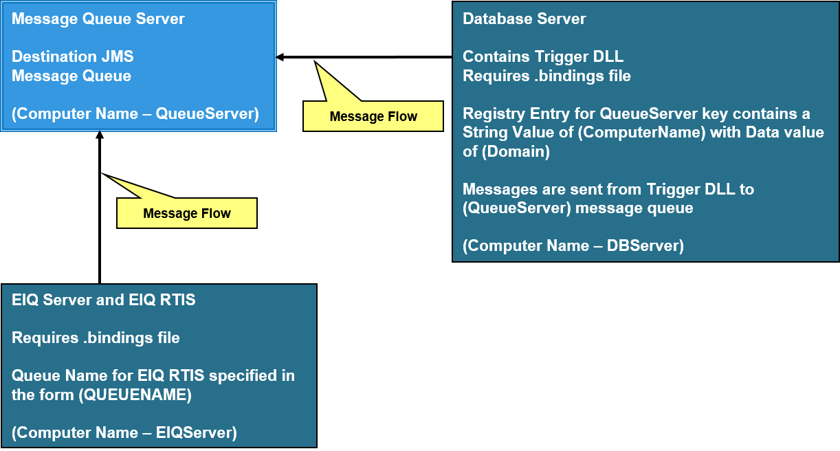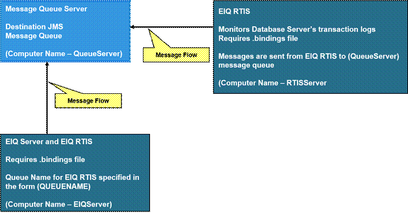 In a multiple server setup, the “.bindings” file generated by the "Java Message Queue Administration Console" must be copied to the JMSConnectionFactory folder for the Database Server and EIQ RTIS computers when using the Trigger DLL as shown in Figure 1. EIQ RTIS can be configured to both monitor the data source for transaction logs to send the information to a queue and then monitor that queue for messages.