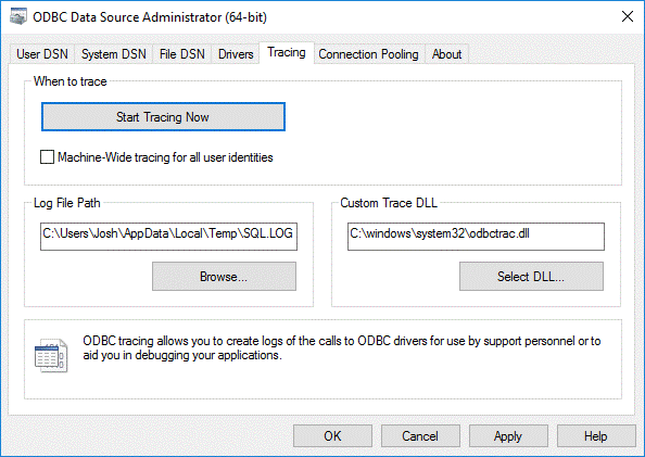 ·         Start ODBC Tracing from the ‘ODBC Data Source Administrator’: