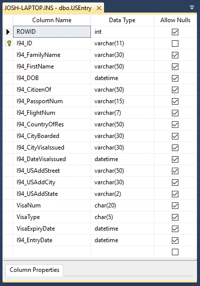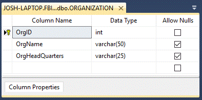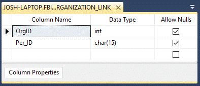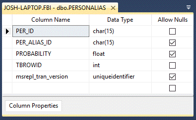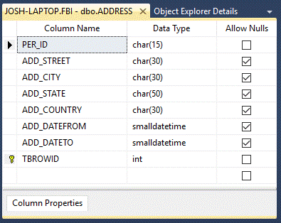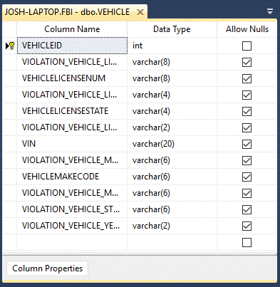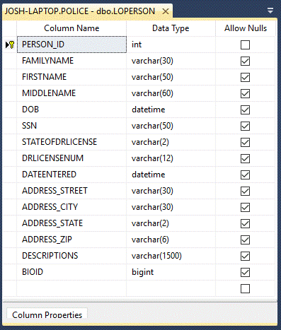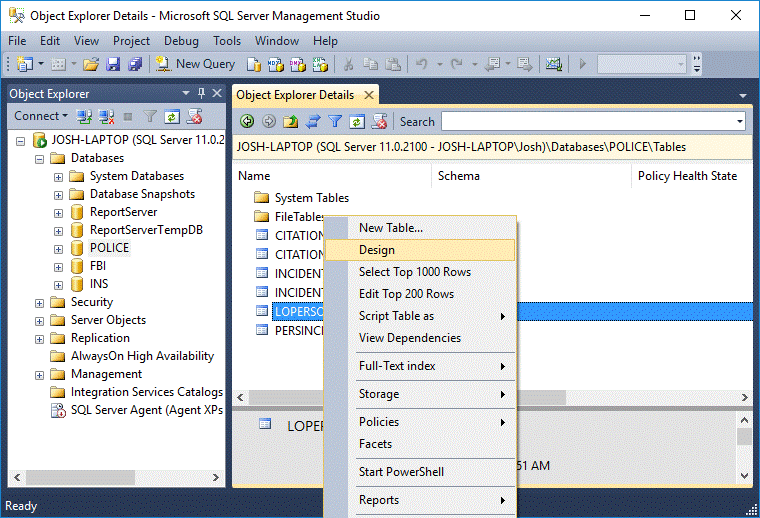 Open the SQL Server Management Studio and connect to the machine where the data source is located (Local). Then, go to the database and their related tables for INS, FBI, or POLICE. For example, to go to the PERSON table of the FBI database using Object Explorer, traverse Databases->FBI->Tables. Right-click on the table in right pane and select 'Modify' or 'Design' to see the table design.