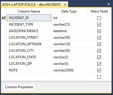 The INCIDENT table contains information about police incidents. Each incident is distinguished by an incident id (INCIDENT_ID column). Other information stored in the table includes incident type, date of incident, location of the incident, and the description of the incident (NOTE column).