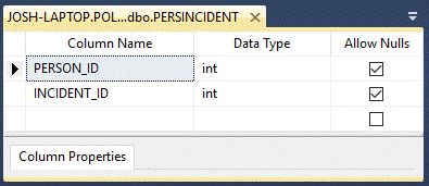 The PERSINCIDENT table associates the PERSON and INCIDENT tables through PERSON_ID and INCIDENT_ID values.