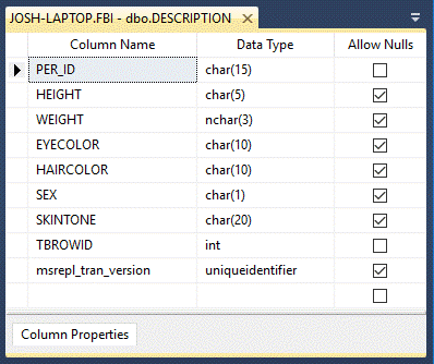 The DESCRIPTION table has information describing persons with attributes, such as eye color, hair color, weight, height, and skin color.