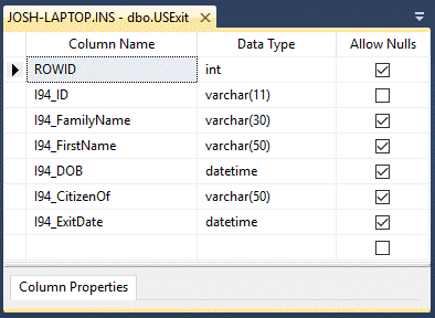 The USEXIT table contains information about the person who leaves the country, such as I94_ID, name, date of birth, nationality, and exit date.