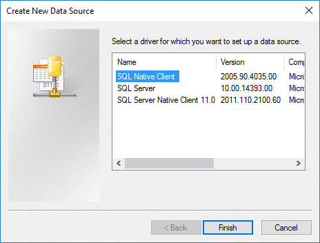 · If you are using SQL Server 2000, select 'SQL Server' as the ODBC driver. For SQL Server 2005, select 'SQL Native Client'. For SQL Server 2008, select 'SQL Server Native Client 10.0'.