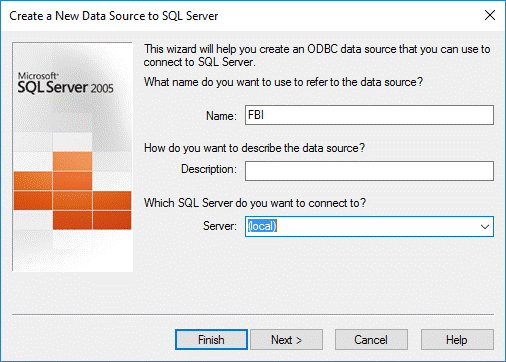 · Enter 'FBI' for the Name; the Description field is optional. Select the server. If it is a local system, select '(local)' and click 'Next'.