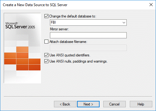 · Change the default database from 'master' to 'FBI' and click 'Next'.