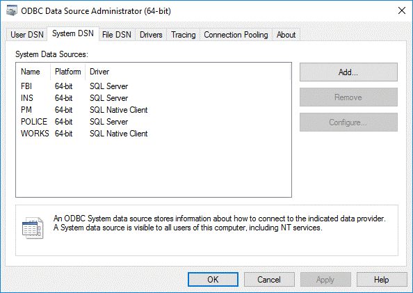 Now you should see the DSNs you created in the System DSN tab (or User DSN tab) of the ODBC Data Source Administrator.