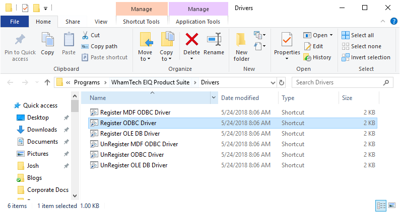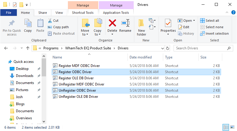 The .bat files are located in the “C:\ProgramData\Microsoft\Windows\Start Menu\Programs\WhamTech EIQ Product Suite\Drivers” file path. ·
