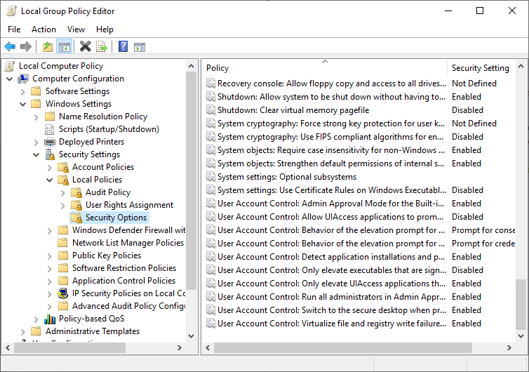 Set “User Account Control: Behavior of the elevation