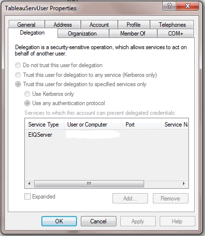 Service name for which the Tableau Server will delegate to. o