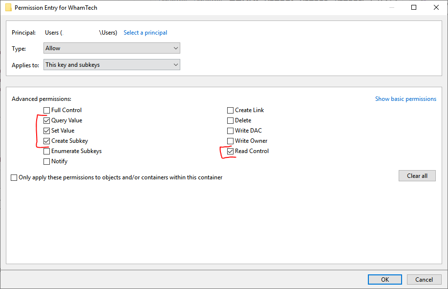 open up the permission entry window, then click “Show Advanced Permissions”. o